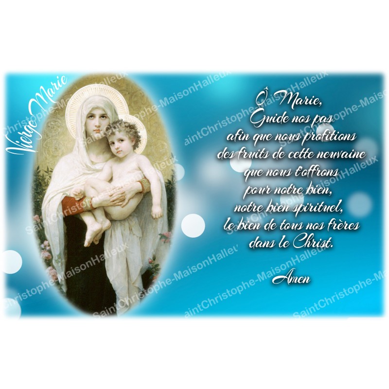 L'autocollant est à l'image de la Sainte Vierge Marie tenant l'Enfant Jésus dans ses bras, avec une prière qui lui est dédiée, sur un beau fond bleu.