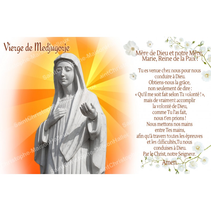 L'autocollant est à l'image de la Sainte Vierge de Medjugorje, sa statue de marbre auréolée de couleurs chaudes, avec une prière qui lui est dédiée entourées de roses blanches.