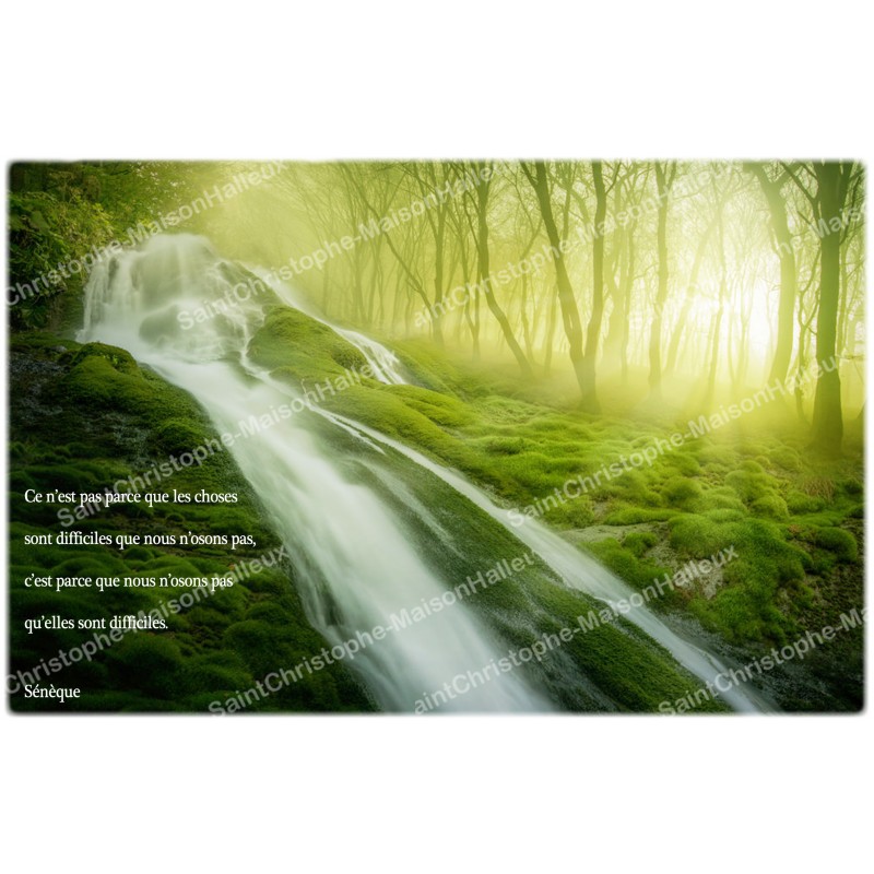 L'adesivo raffigura un fiume che scorre in una foresta muschiosa, con raggi di luce che filtrano tra gli alberi, e una citazione di Seneca sulla difficoltà delle cose e sul coraggio di osare.