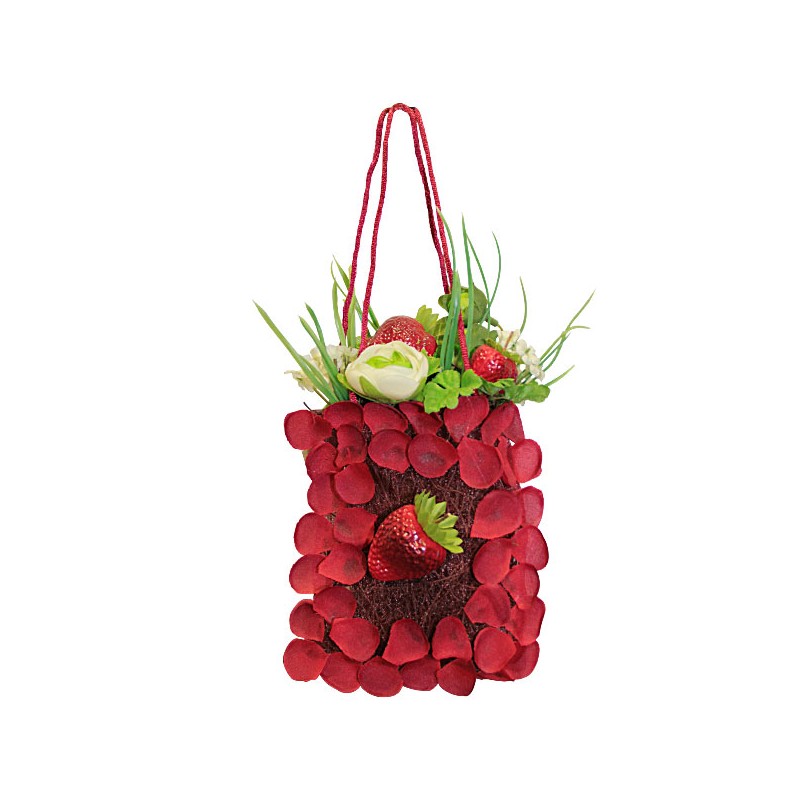 Decorazione da appendere con fiori e frutti artificiali, in un sacchetto di stoffa ricoperto di petali, tutto nei toni del rosso e del bianco. Un bellissimo bouquet per una decorazione festiva come una celebrazione del matrimonio o il giorno di San Valentino!