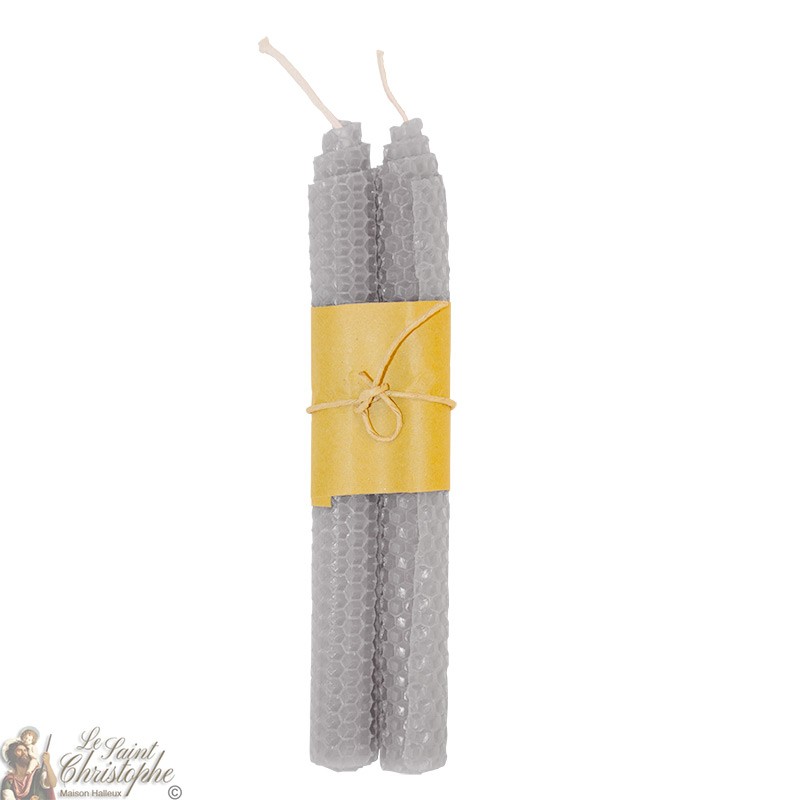Coppia di candele di desiderio colorate nella massa in grigio. La cera è arrotolata e ricoperta da un motivo esagonale che ricorda un alveare.
