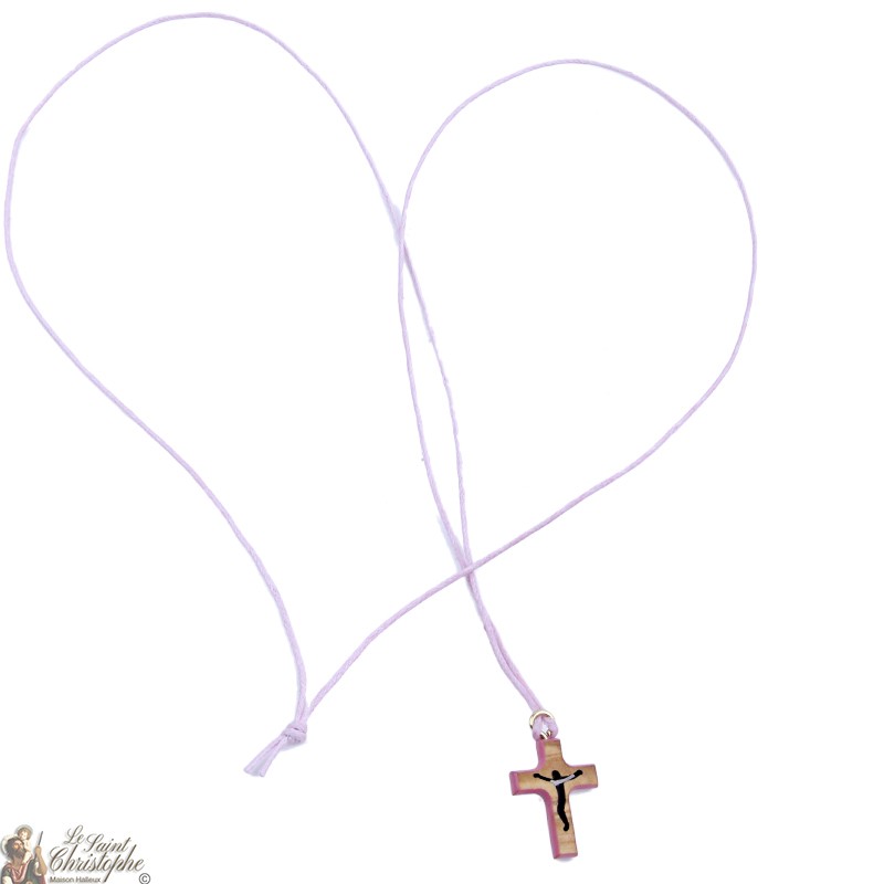 Collana corda rosa e piccola croce di legno rosa con Cristo.