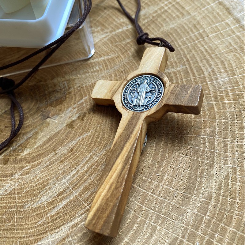 Questa collana è realizzata in cordoncino intrecciato e ha un ciondolo in legno d'ulivo a forma di croce di San Benedetto. Questa croce ha la particolarità di avere una medaglia di San Benedetto dietro la testa del Cristo, un simbolo molto potente di protezione e guarigione. Le parti metalliche sono in argento: la figura di Cristo, la medaglia e il cartiglio INRI. Il legno d'ulivo è leggermente colorato per evidenziare le forme della croce.