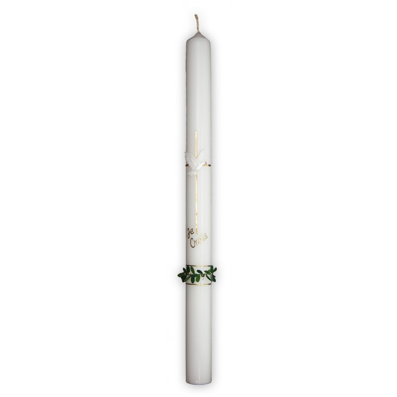 Candela di comunione bianca con il testo Je Crois in francese. La candela è decorata con una croce, una colomba e foglie verdi.