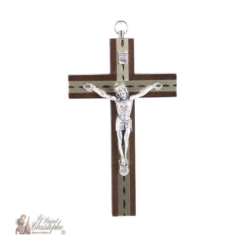 Croce in legno marrone con Cristo con metallo dorato - 15 cm