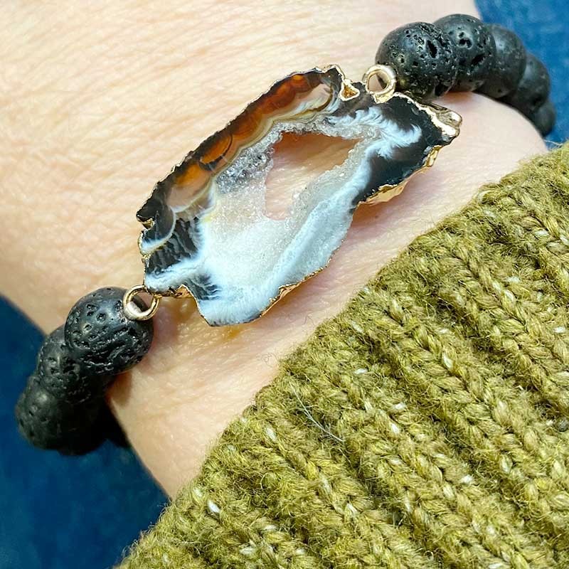 Questo bracciale in pietra naturale è composto da pietre laviche tagliate in perline rotonde e da una fetta di agata. Questo gioiello semplice ed estetico è un legame con il mondo e le sue energie benefiche.