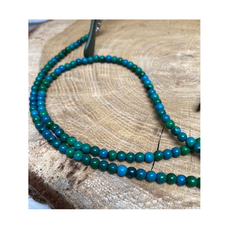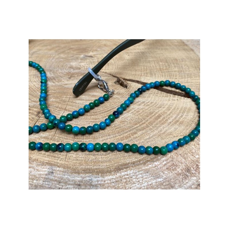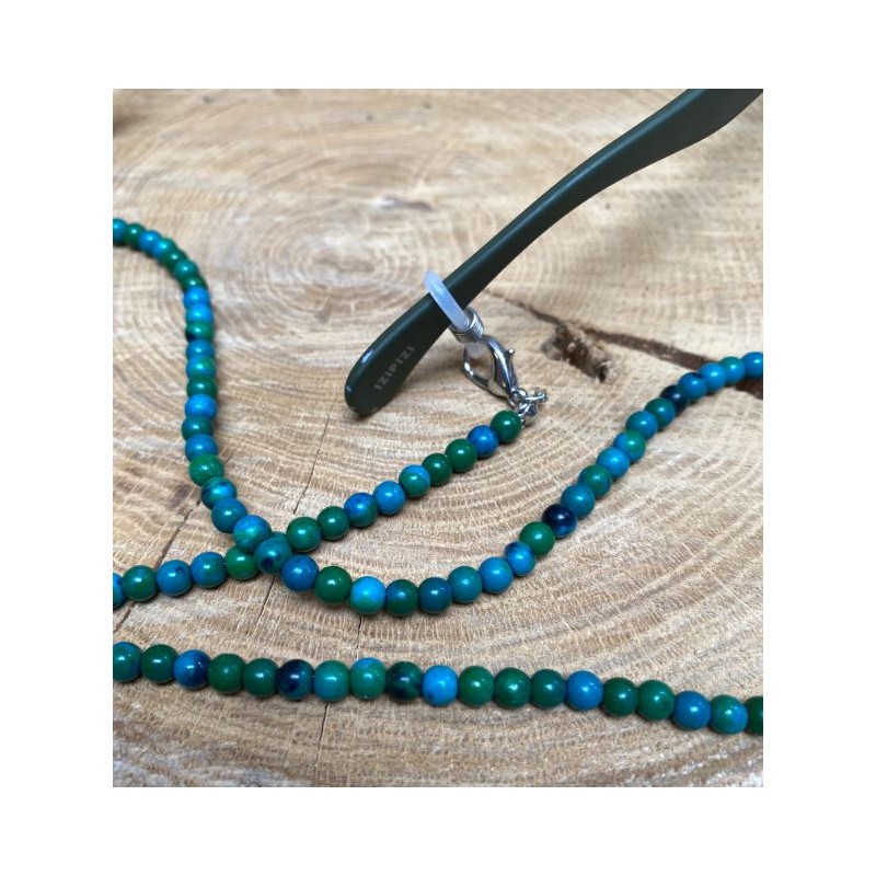 Questo cordino per occhiali è un accessorio chic e pratico. Pratico per avere sempre con sé gli occhiali senza doverli indossare, chic grazie alle perle di turchese, una pietra pregiata rinomata in litoterapia per le sue virtù.