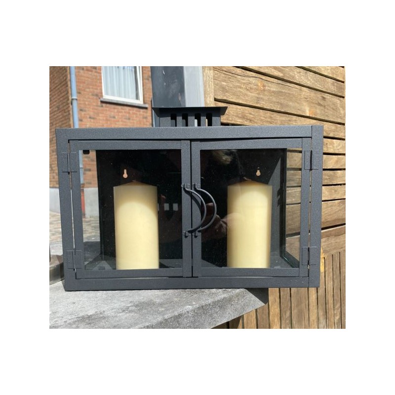 Grande lanterna rettangolare in vetro con due porte e due portacandele.