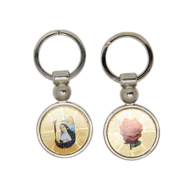 Portachiavi in metallo tondo argento con doratura a doppia faccia con Sainte Rita e una rosa.