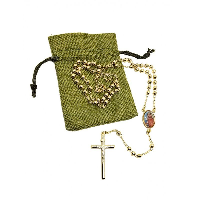 Rosario del Sacro Cuore di Maria placcato oro 14 carati, con chiusura a moschettone per l'aggancio come collana. La medaglia centrale del Sacro Cuore di Maria è a colori, con una croce incisa sul retro. Venduto con un astuccio per la conservazione.