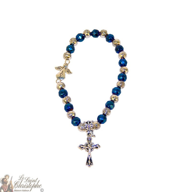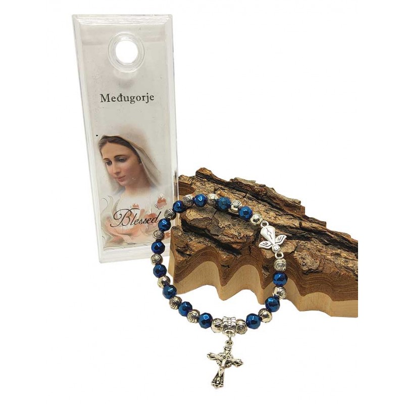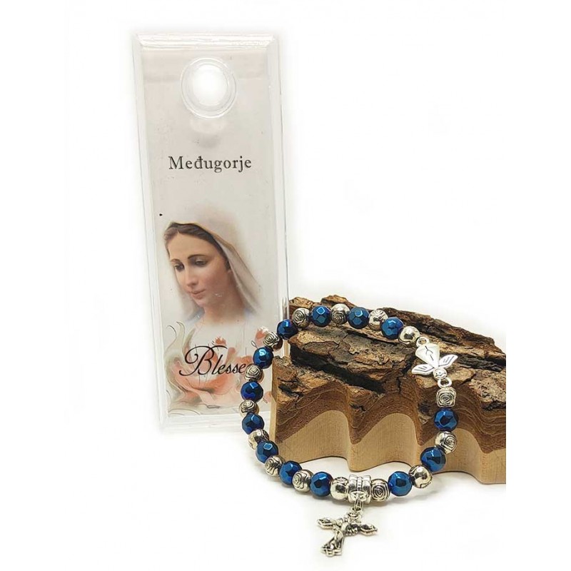 Deze elastische armband, met glanzende blauwe en zilveren kralen gesneden in rozen, is versierd met twee kleine bedeltjes: een schattige engel versierd met een hartje en een kruisje met Jezus erop. De armband wordt beschermd door een mooie transparante koffer en gaat vergezeld van een afbeelding van Onze-Lieve-Vrouw van Medjugorje. De armband kan ook als duizelingwekkende armband gebruikt worden.