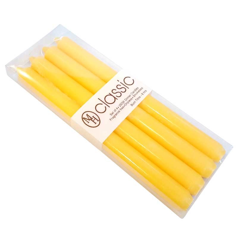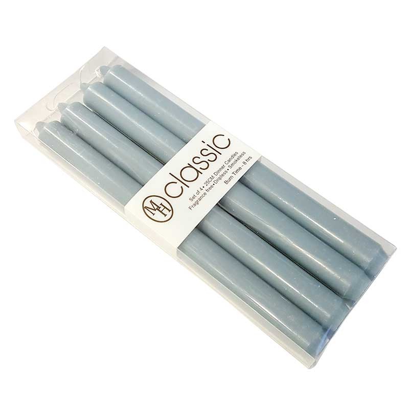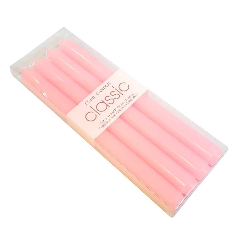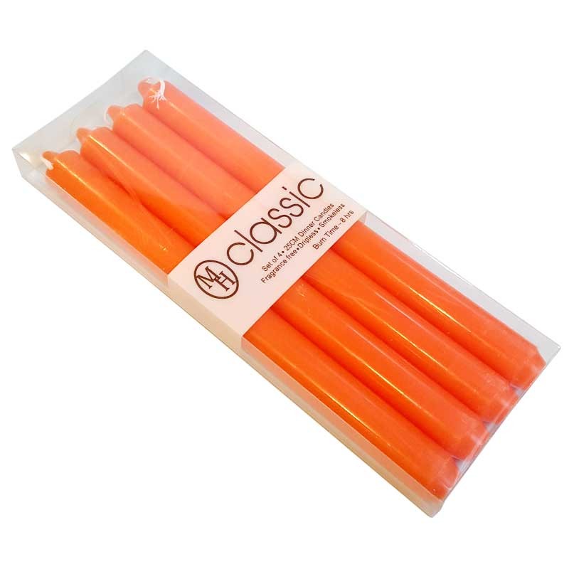 Pallet van 16 dozen, elk met 48 sets van 4 gekleurde tafelkaarsen in de massa MH. Ze zijn 25 cm hoog, geven geen geur of rook af en druipen niet.