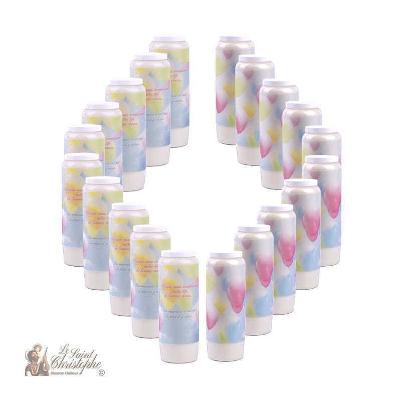 (20 neutrale noveenkaarsen en 20 stickers zullen in de doos zitten)