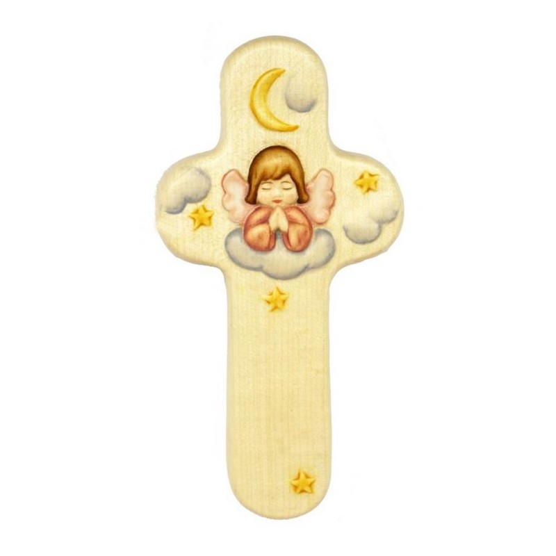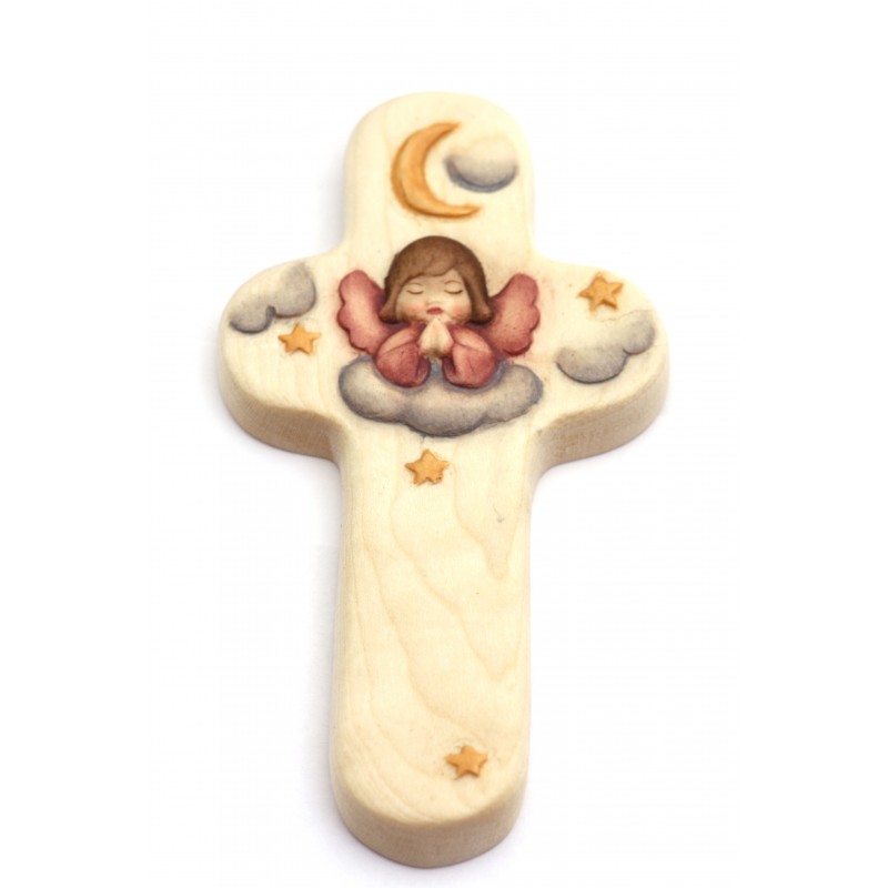 Gesneden houten muurkruis van een natuurlijke kleurengel en roze tonen