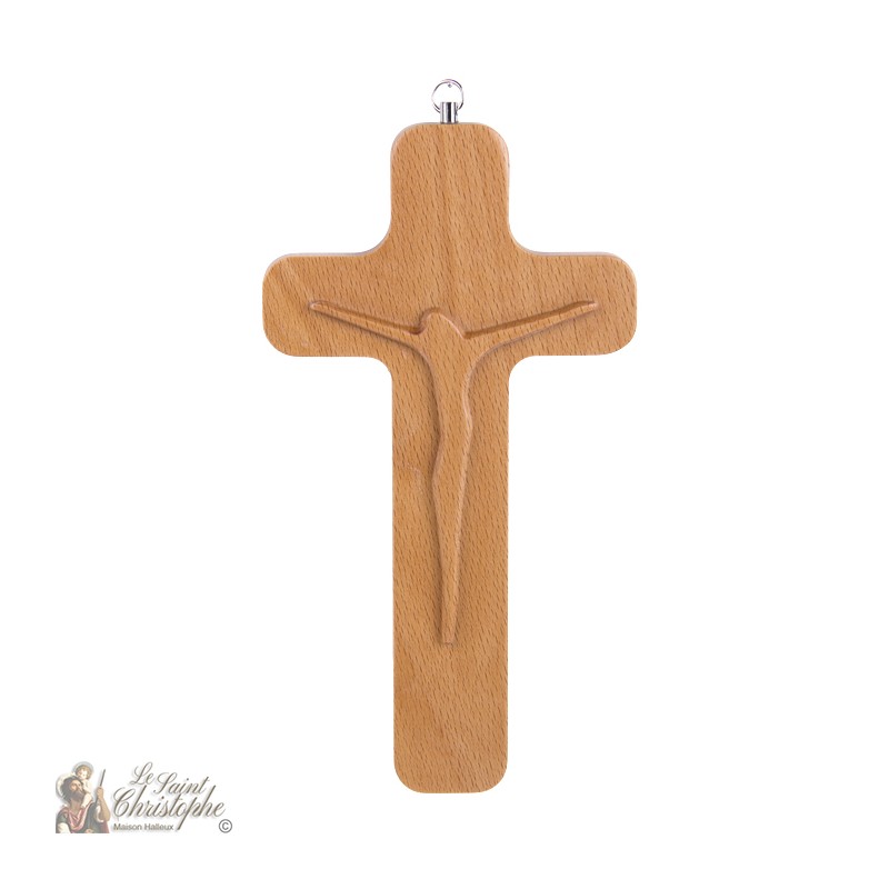 Houten kruis gesneden met het lichaam van Christus. Eenvoudig en gestileerd, het kruis is afgerond met de vorm van Jezus Christus delicaat geschetst, uit één stuk. Het kruis heeft een ring om het naar believen op te hangen.