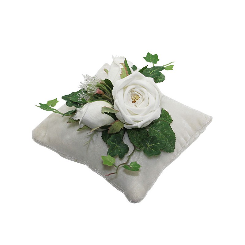 Kussen met vanillegeur versierd met witte rozen. Het is perfect als tafeldecoratie, opgehangen aan de muur of op een dressoir. Mogelijk geschikt voor het plaatsen van trouwringen of als cadeau voor gasten.