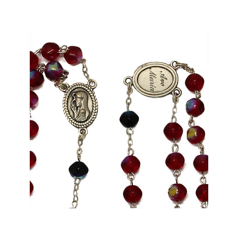 Rozenkrans met veelkleurige iriserende rode kralen van facetgeslepen glas, aan een verzilverde metalen ketting. Op de medaille staat het gezicht van de Heilige Maagd en een Weesgegroet.