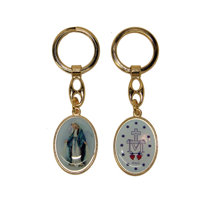 Sleutelhanger van de Wonderbaarlijke Maagd - blauw ovaal - goudkleurig