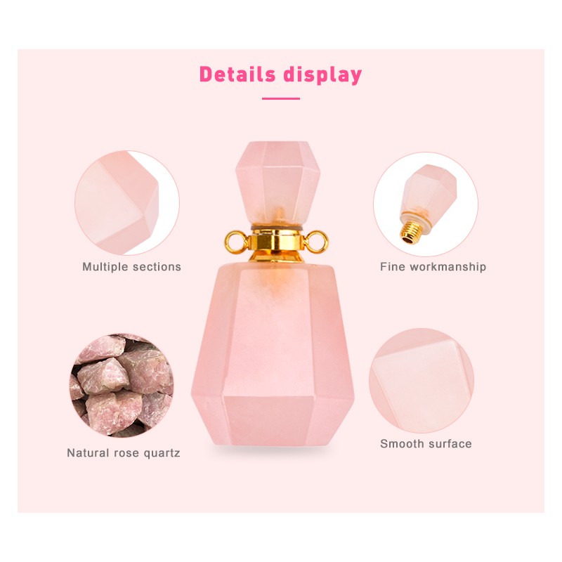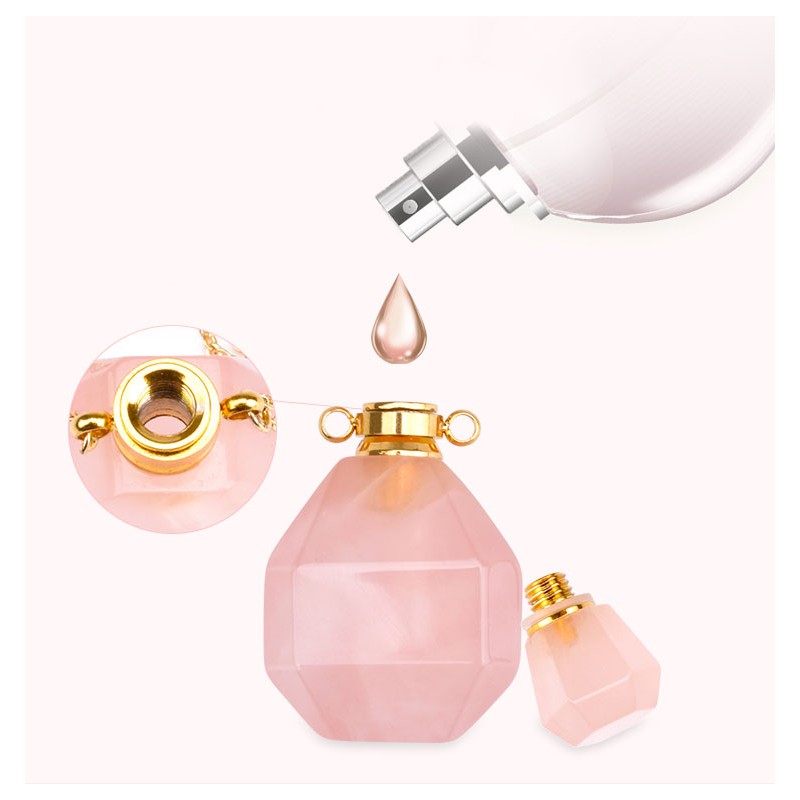 Deze ketting combineert originaliteit, welzijn en schoonheid! Gemaakt van rozenkwarts, de steen van onvoorwaardelijke liefde voor jezelf en anderen, kun je op het kleine flesje dat als hanger dient een paar druppels van je favoriete parfum doen. Met de bijgeleverde pipet kan de vloeistof gemakkelijk van de ene naar de andere fles worden overgebracht. Als u het parfum wat meer uit de fles wilt laten lopen, verwijdert u het kleine siliconenlipje onder de dop.