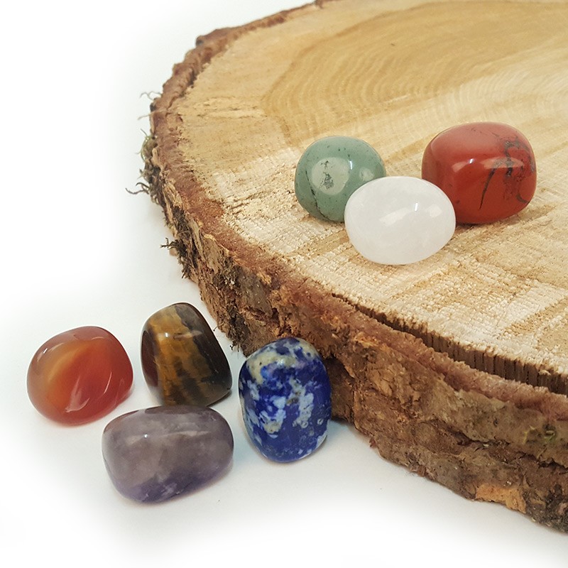 Bevat één rode jaspis, één carneool, één tijgeroog, één aventurijn, één lapis lazuli, één amethist en één bergkristal.