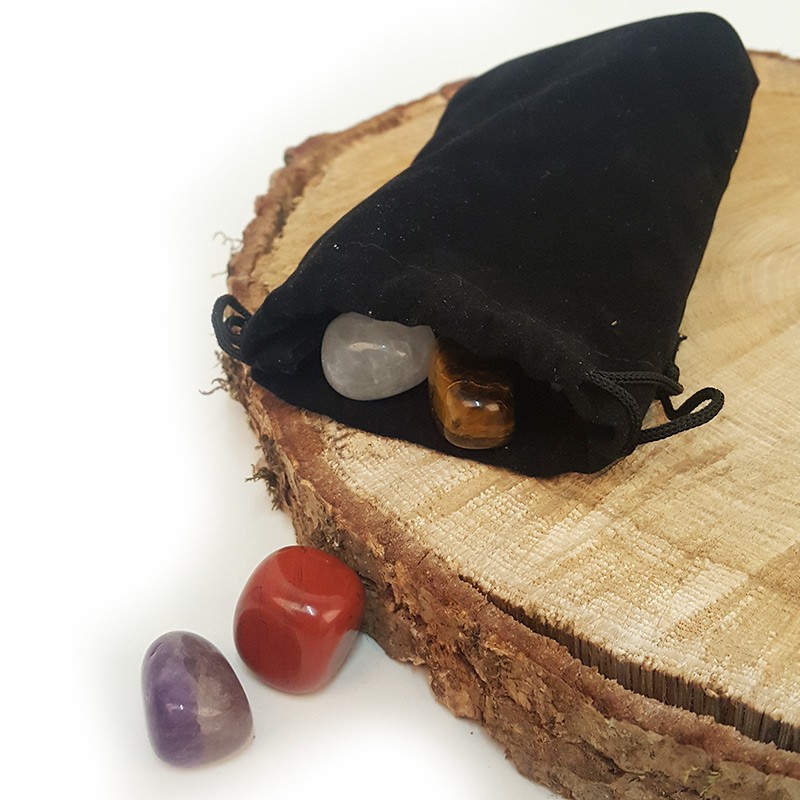 Zwart fluwelen zakje met zeven helende stenen, één voor elk chakra, om de energieën van het lichaam weer in evenwicht te brengen.