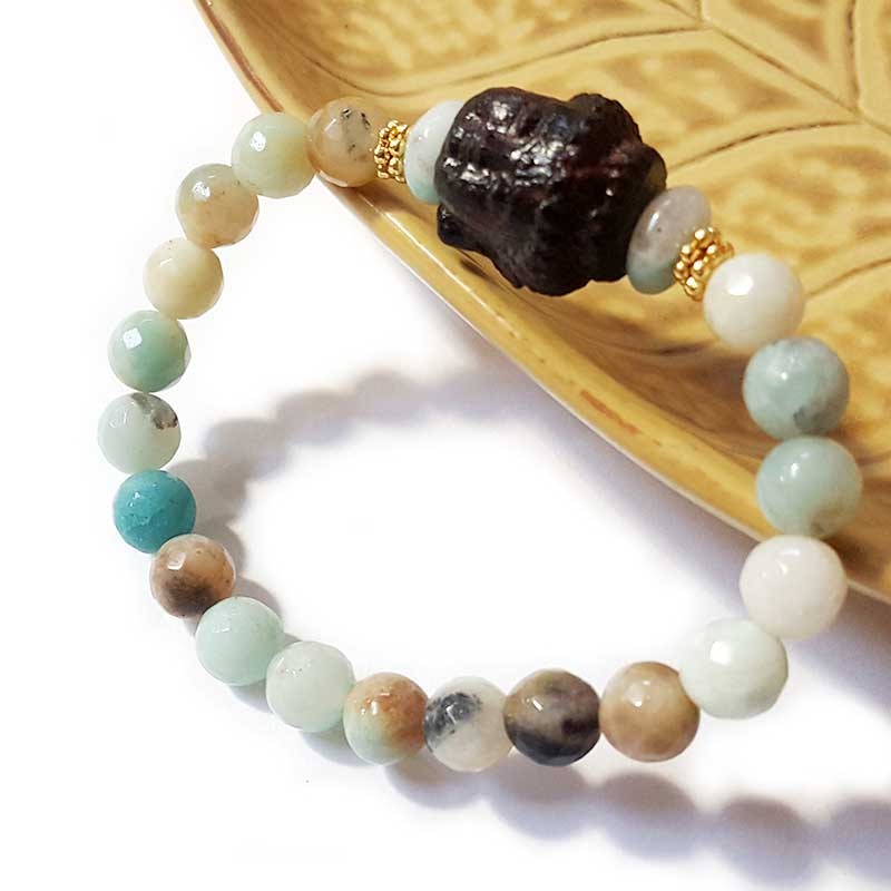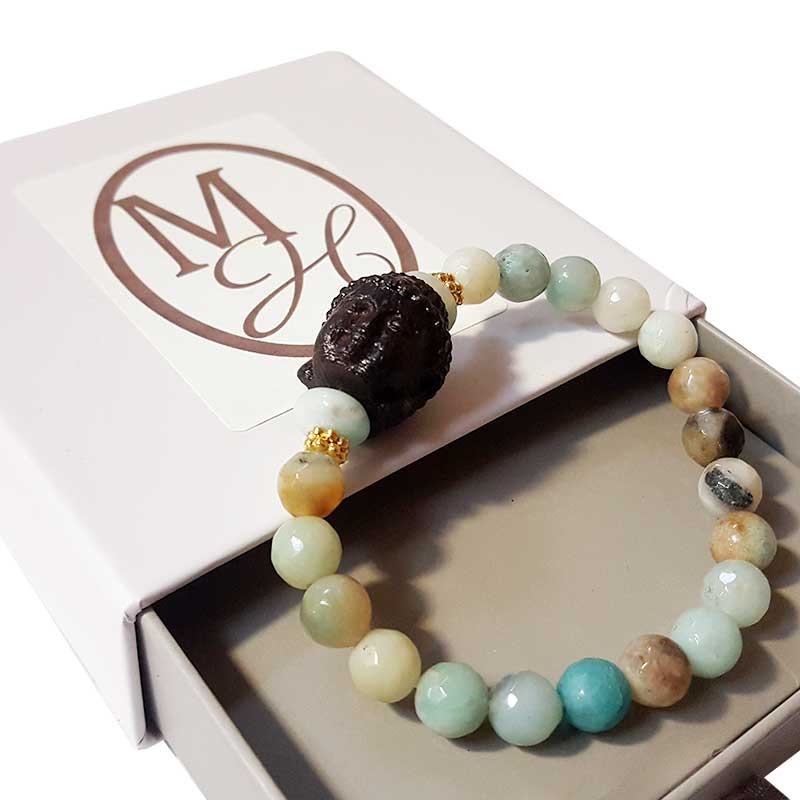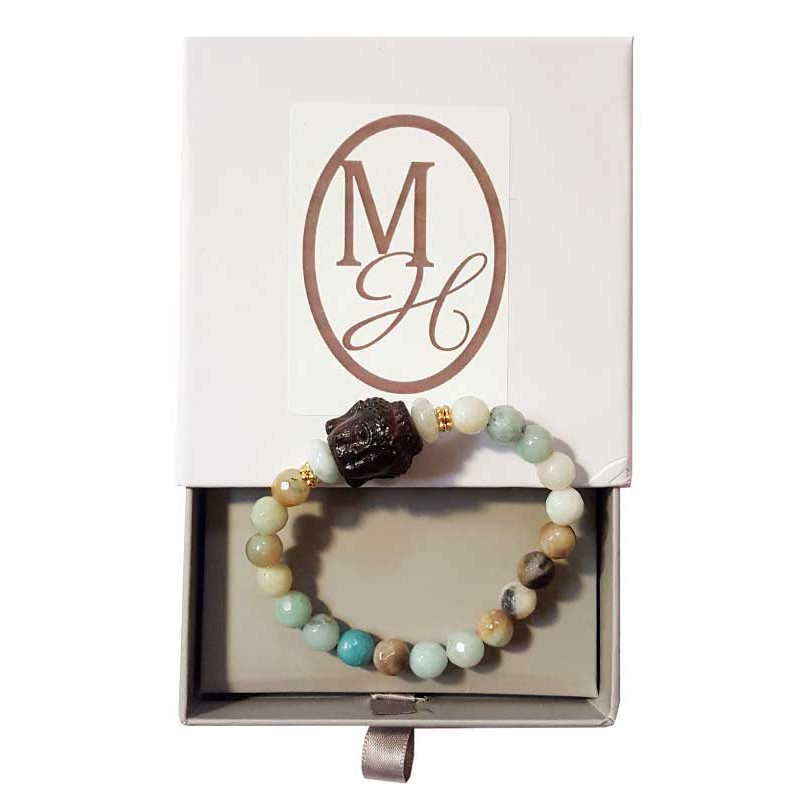 Deze armband van ronde, licht gefacetteerde stenen kralen is voorzien van een gebeeldhouwd Boeddhahoofd. De kralen zijn een mengsel van amazoniet en rivierstenen. Een eenvoudig sieraad dat een vleugje zachte kleuren en een klein bubbeltje rust brengt!