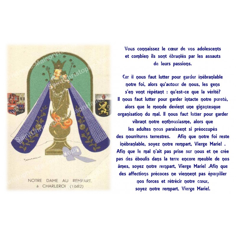 Sticker voor noveenkaars met afbeelding van Onze-Lieve-Vrouw aan de vestingmuur en aan haar opgedragen gebed. De sticker is bedoeld voor de volledige omtrek van een kaars met een diameter van 6 cm en een hoogte van 18 cm. Deze sticker wordt aanbevolen voor witte noveenkaarsen, maar kan naar eigen smaak ook op een gekleurde kaars worden gebruikt.