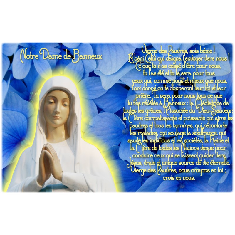 De sticker is een afbeelding van de Heilige Maagd van de Armen van Banneux Notre-Dame op een achtergrond van blauwe bloemen, met een aan haar opgedragen gebed.