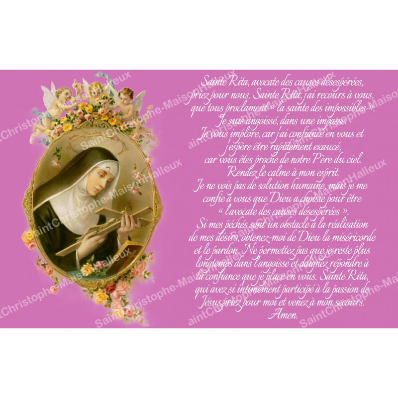 De sticker is een afbeelding van de heilige Rita, die het kruis van Jezus Christus in haar handen houdt, afgebeeld in een mooie bloemenkader met kleurrijke rozen en engelen, met een aan haar opgedragen gebed, alles op een roze achtergrond.