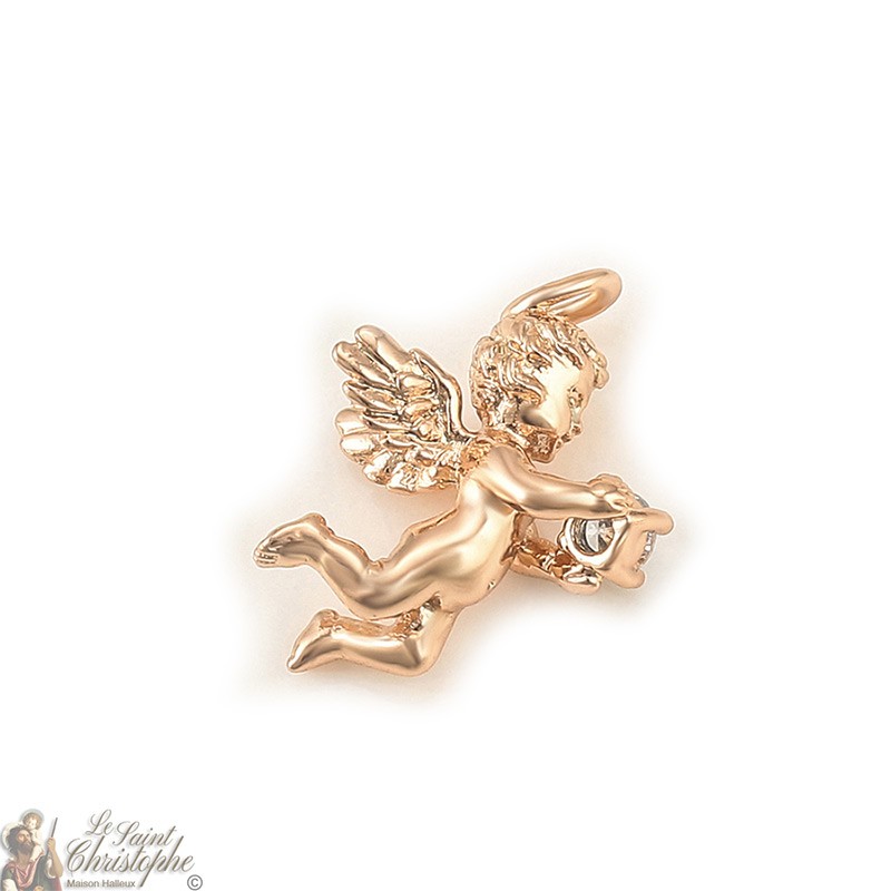 Deze discrete en fonkelende hanger stelt een cherubijn voor die een kristal vasthoudt. Met zijn licht rozige goudkleur kan het engeltje worden gecombineerd met een brede waaier van kettingen en halskettingen.