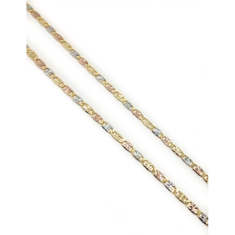 Waterbestendige, vergulde ketting met brede driekleurige schakels: zilver, goud en roségoud. Dankzij de speciale afwerking blijft het sieraad glanzend en beschermd, ook na verloop van tijd, en kan het onder water worden gedragen zonder te verkleuren. Deze schitterende en verfijnde ketting kan zowel alleen als met een hanger worden gedragen.