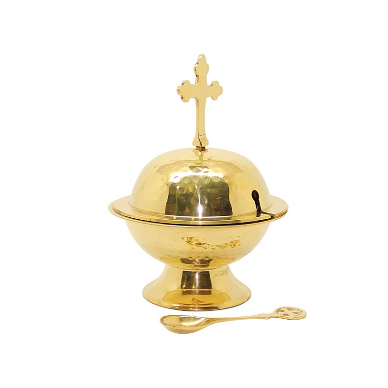 Pendeldienst naar de wierook koper, met de hand bewerkt, met deksel bekroond door een kruis.
